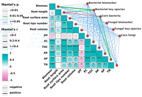 Mantel test analysis of plant growth, environmental factors, and microbial community (biomarkers were analyzed according to Figure 6, key species were analyzed according to Figure 5, and the fraction of the core bacterial/fungal species analyzed with a Veen plot are shown in Figure 3). *, **, and *** represent p < 0.05, p < 0.01, p < 0.001, respectively; a dark green square represents significant positive relationships, and a pink square represents negative relationships. The darker the color or the larger the square area, the greater the absolute value of the correlation coefficient; red lines represent p < 0.01, green lines represent 0.01 < p < 0.05, blue lines represent p ≥  0.05, — represents a positive relationship, --- represents a negative relationship, and the width of the line represents the magnitude of the correlation coefficient.