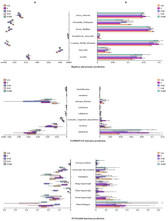 FUNGuild function prediction showed that FSB and FSBF significantly improved functions associated with plant saprotroph and wood saprotroph in the rhizosphere soil, while it suppressed Arbuscular Mycorrhizal fungi (AMF) activity in the rhizosphere soil and limited wood saprotroph and endophyte activities in the bulk soil. Meanwhile, FSBF was predicted to improve endophyte activities in the rhizosphere soil, and FSB was predicted to increase the presence of dung saprotroph in the rhizosphere soil. In addition, FSF was predicted to increase plant pathogens in both the rhizosphere soil and the bulk soil, while FSB was predicted to have the exact opposite effect in the plant pathogens.