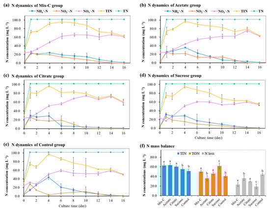 N dynamics and N mass balance during the enrichment process of nitrifying bioflocs in the reactors by different organic carbon additions (means ± S.D., n = 3). Mix-C: mixture of sodium acetate, sodium citrate, and sucrose; Control: no organic carbon addition; TIN: total inorganic nitrogen; TN: total nitrogen of input. Different letters in (f) indicate significant differences among five groups (p < 0.05).