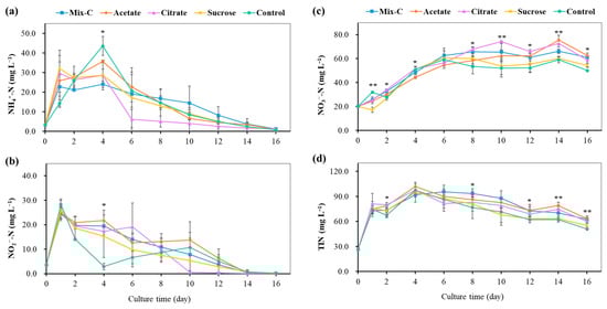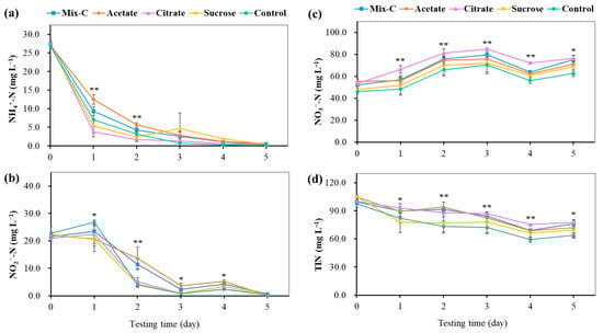 Nitrification performance of nitrifying bioflocs enriched from different organic carbon additions in the reactors. (a): Concentration change of NH4+-N, (b): Concentration change of NO2−-N, (c): Concentration change of NO3−-N, (d): Concentration change of TIN. Mix-C: mixture of sodium acetate, sodium citrate, and sucrose; Control: no organic carbon addition; TIN: total inorganic nitrogen. The asterisk indicates significant differences among the five groups (*, p < 0.05; **, p < 0.01).