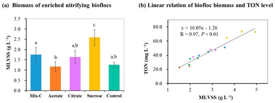 The addition of specific organic carbon could not only contribute to shortening the enrichment period but also to increasing biomass production during the culture of nitrifying bioflocs. It was shown that the nitrification process was completely established in all reactors on day 16, and the biomass production of nitrifying bioflocs in terms of MLVSS was between 1170.4 mg L−1 and 2588.0 mg L−1 (Figure 3a). Significant differences in MLVSS were observed among five groups, with the sucrose group the highest and the control group lowest. This indicates that the promotional effects of the three organic carbon sources in addition to the production of bioflocs had varying extents. The organic carbon addition could promote the growth of heterotrophic nitrifying bacteria to form bioflocs, which further provides an attachment matrix for autotrophic nitrifying bacteria growth [,,]. Moreover, a significantly positive linear relation (R = 0.97, p < 0.01) of biofloc biomass and TON level could be found (Figure 3b), indicating that TON in the reactor should be mainly derived from cultured bioflocs []. For biomass production, the sucrose group showed the highest enriched biomass of nitrifying bioflocs, with MLVSSs of 2588.0 ± 384.7 mg L−1 (Figure 3a).