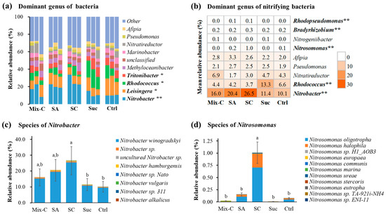 Effects of different organic carbon additions on nitrifying bacteria of enriched bioflocs identified from metagenomic sequencing (means ± S.D., n = 3). Mix-C: mixture of sodium acetate, sodium citrate, and sucrose; SA: sodium acetate; SC: sodium citrate; Suc: sucrose; Control: no organic carbon addition. The asterisk indicates significant differences among the five groups (*, p < 0.05; **, p < 0.01); different letters indicate significant differences among the five groups (p < 0.05).