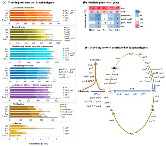Effects of different organic carbon additions on the N-cycling functional genes of enriched bioflocs by analyzing metagenomic data against the KEGG pathway database (means ± S.D., n = 3). For N-cycling processes and involved functional genes, different colors of arrow indicate specific N-transformation processes, and the thickness of each arrow is proportional to the total abundance of involved functional genes. Mix-C: mixture of sodium acetate, sodium citrate, and sucrose; SA: sodium acetate; SC: sodium citrate; Suc: sucrose; Ctrl: control, no organic carbon addition. Different letters indicate significant differences among the five groups (p < 0.05).