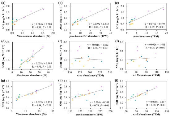 Relationships of nitrification efficiencies and nitrifying bacteria and genes of nitrifying bioflocs enriched from different organic carbon additions in the reactors based on linear regression analysis (n = 15). The dots with five colors represent five groups. (a): Linear relation of AOR and Nitrosomonas abundance, (b): Linear relation of AOR and pmoA-amoABC abundance, (c): Linear relation of AOR and hao abundance, (d): Linear relation of NNR and Nitrobacter abundance, (e): Linear relation of NNR and nxrA abundance, (f): Linear relation of NNR and nxrB abundance, (g): Linear relation of SNR and Nitrobacter abundance, (h): Linear relation of SNR and nxrA abundance, (i): Linear relation of SNR and nxrB abundance. AOR: ammonia oxidation rate; NNR: net nitrification rate; SNR: specific nitrification rate.