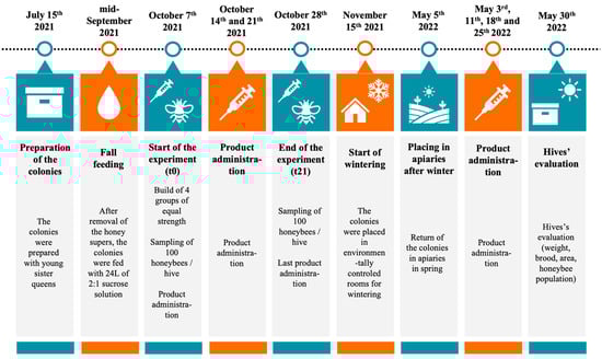 Chronology of the experiment. Colonies were prepared in July 2021. Honey supers were removed in early September 2021 and feeding (sucrose solution 2:1) was implemented in mid-September. Exposure to study products began on 7 October (t0, day of first sampling) and was repeated weekly until 28 October (t21, second sampling). The colonies were then placed in an environmentally controlled room for the duration of the wintering period on 15 November. They were assessed at the end of the overwintering period (20 April 2022) for weight, brood, and honeybee population, and then placed in two apiaries.