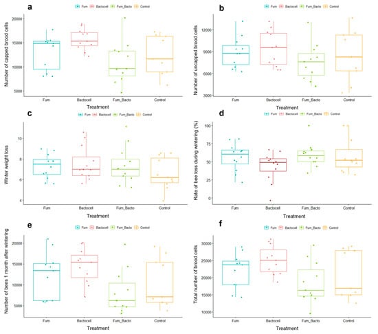 Zootechnical performance traits of colonies after overwintering. The (c,d) show variables measured two days after wintering. The (a,b,e,f) represent variables measured a month after wintering (the dead colonies were removed in statistical analysis). (a) Number of capped brood cells according to of treatment. Variable indicating future bees to be born in the colony. (b) Number of uncapped brood cells according to treatment. Variable representative of the queen’s egg-laying activity. (c) Winter weight loss. (d) Rate of bee loss during wintering (in %). (e) Total number of bees 1 month after wintering. Variable indicating colony strength. (f). Total number of brood cells by treatment. Variable indicating colony development.