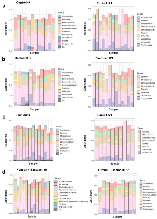 In the four groups, bees sampled at t0 showed more taxa than the bees sampled after 21 days. The 100 most abundant ASVs represent 60% to 100% of the total number of sequences in all charts. The most abundant genus is Lactobacillus. For the control (Figure 3a) at t0, the genera Arsenopoenus, Bartonella, Bifidobacterium, Bombilactobacillus, Commensalibacter, Gilliamella, Lactobacillus, Pseudomonas, Serratia, and Snodgrassella are represented. At t21, Pseudomonas and Serratia decreased under the threshold of the 100 most abundant taxa. On the contrary, two new genera were detected at t21, Frischella and Limnobacter. The Bartonella genus appeared to be less abundant, while the abundance of Snodgrassella and Gilliamella seems to have increased. The Tukey test comparing the abundance of each genus between t0 and t21 showed a significant decrease of 3.8% for the genus Commensalibacter and a significant increase of 7.3% for the genus Gilliamella for the Control (p-values of 0.033 and 0.044, respectively). In the case of Bactocell® (Figure 3b) at t0, Arsenophonus, Bartonella, Bifidobacterium, Bombilactobacillus, Commensalibacter, Frischella, Gilliamella, Lactobacillus, and Snodgrassella were the most abundant genera, as well as a non-identified genus. At t21, the genus Arsenophenus and the non-identified genus abundances dropped below the 100 most abundant taxa threshold. The Tukey test showed a significant decrease of 1.7% for the genera Arsenophonus in the Bactocell group between t0 and t21 (p-value 0.005). The Fumidil B® group (Figure 3c) at t0 shared all but one genus with the Bactocell group (Frischella). The genus Arsenophonus and a non-identified genus became undetected at t21 whereas Frischella was detected. The Tukey test showed a marginally significant decrease of 2.6% for the genus Commensalibacter and significant decrease of 1.2% of Arsenophonus and a significant increase of 8% for Gilliamella for Fumidil B® between t0 and t21 (p-values of 0.099, 0.013 and 0.004, respectively). Finally, for the bees that received the Bactocell®/Fumidil B® combination (Figure 3d), Arsenophonus, Bartonella, Bifidobacterium, Bombilactobacillus, Commensalibacter, Gilliamella, Lactobacillus, Methylobacterium-methylorubrum, Pantoea, Snodgrassella, and an unidentified genus were detected at t0. At t21, eight of them were still detected: Arsenophonus, Bartonella, Bifidobacterium, Bombilactobacillus, Commensalibacter, Gilliamella, Lactobacillus, and Snodgrassella. In addition, Frischella and Limnobacter became detectable at t21. For this group, the Tukey tests showed a significant increase of 3.2% in Lactobacillus and a significant decrease of 5.3% in Commensalibacter between t0 and t21 (p-values of 0.038 and 0.069, respectively).