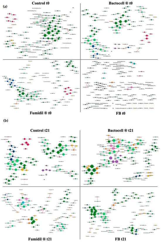 Sub-networks were created to compare the groups at the end of treatment in terms of microbiota interaction networks. The parameters of these sub-networks have been grouped together in Table S4a,b of the Supplementary Material and the means for each group in Table 4.