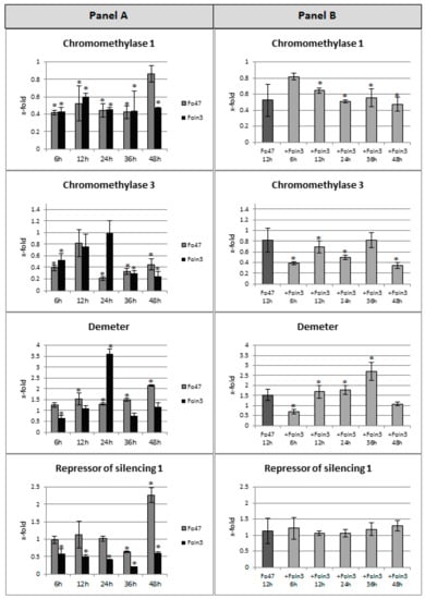 Expression levels of genes involved in DNA methylation (chromomethylase 1, chromomethylase 3, demeter, repressor of silencing 1, argonaute 1, argonaute 4, RNA-dependent RNA polymerase 2) in flax seedlings treated with non-pathogenic (Fo47) or pathogenic strains of Fusarium oxysporum (Foln3) (panel A) and after sensitizing effects of the non-pathogenic strain treated with pathogenic Foln3 (+ Foln3) (panel B) at 6, 12, 24, 36, and 48 h after inoculation. The data were obtained from real-time RT-PCR analysis. Actin was used as a reference gene and the transcript levels were normalized to the control plant. The data represent the mean ± standard deviations from three biological repetitions. Asterisks mark statistically significant differences (p < 0.05) between the treated samples and their own controls.