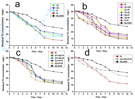 Residual tetracycline (TC) concentration in the lysogeny broth (LB) medium: (a) TC degradation of each single strain, (b–d) Comparision between the best strain (Raoultella sp. XY-1) and the bacterial consortia. S1: A. faecalis S-1; S2: A. faecalis S-2; P: Pandoraea sp. XY-2; R: Raoultella sp. XY-1. BLANK stands for control groups without adding bacteria.