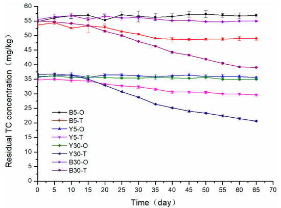 Residual TC concentration recorded in the soil. B and Y indicate the two soil samples. 5 and 30 are the set temperatures in the experiment. T indicates experimental groups, to which the TC-degrading bacterial consortium was introduced, and O indicates control groups, to which the same amount of inactivated bacterial suspensions were added.