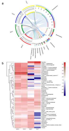(a) Circos diagram showing the relative abundance of the bacterial communities at the phylum level, (b) Heatmap showing the relative abundance of bacterial communities at the genus level. B30-O and Y30-O stand for original soil samples, while B30-T and Y30-T stand for soil samples collected on day 65.