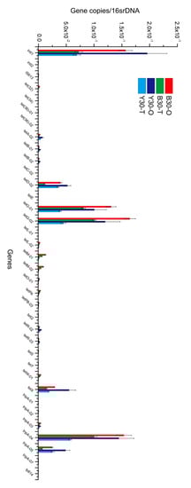 As illustrated in Table 1, the detection rates of TRGs and MGEs belonging to different mechanisms were different between the four groups (B30-O, Y30-O, B30-T, and Y30-Y). As for the overall detection rate of TRGs in the original soils, sample B was higher than sample Y, which could be attributed to the higher TC concentration in soil sample B, since the higher selective pressure of antibiotics may proliferate the TRGs hosts, thus leading to more frequent incidence of TRGs. A previous study reported that high detection rate of ARGs indicated more existence of ARG hosts [], hence there may exist more TRGs-carrying microbes in soil sample B. In addition, differences in soil properties may also lead to different detection rates of TRGs. For instance, TRGs were found to be more prevalent in wet soils than in dry soils [], which was in accordance with the obtained result, as soil sample B had a higher SMC than soil sample Y. Additionally, soil pH, SOM, and TOC of soil sample B were relatively higher (Table S1), which may contribute to more frequent occurrence of TRGs. The overall detection rate of MGEs in original soils (B30-O and Y30-O) was similar between the two samples. However, the overall detection rates of both TRGs and MGEs surprisingly declined after the microbial remediation, which may indicate that the introduction of the TC-degrading bacterial consortium was less likely to cause proliferation of TRGs and MGEs.