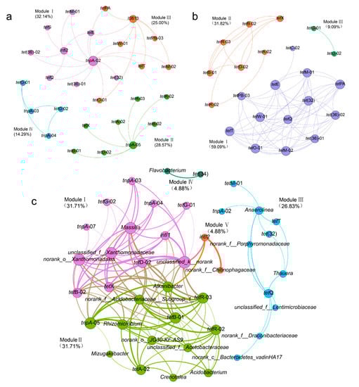 Network analysis was performed to predict the MGE-mediated gene transfer of TRGs (Figure 5a), to reveal the co-occurrence of TRGs (Figure 5b) and to identify the potential hosts of TRGs and MGEs (Figure 5c). Data with a statistically significant correlation (p-value) were retained for visualization. In Figure 5, the value of Spearman’s rank correlation coefficients (r) was proportional to the thickness of each edge between nodes, the size of node in the network was positively correlated with the number of connections, and the node with the most linkages was considered ‘hub’, which could be recognized as the indicator of its associated genes. The modularity generated by Gephi-0.9.2 indicated the division of the network. Each module accounted for different proportions and the biggest one may be considered as the representative of the association between TRGs, MGEs, and bacterial communities in soil.