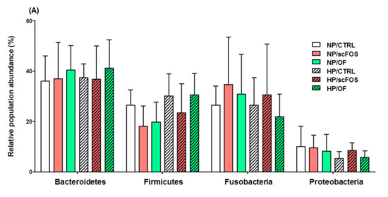Effects of prebiotic supplementation and dietary protein level on major (A) and minor (B) phyla found in the fecal microbiota of obese dogs. CTRL: control; OF: oligofructose; scFOS: short-chain fructo-oligosaccharides; NP: normal protein; HP: high protein.