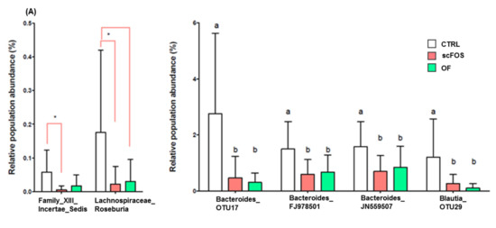 Significant differences between dietary protein levels were observed at the genus level, as the proportion of Lachnospiraceae Blautia was higher, while that of Bacteroidaceae bacteroides was lower with the HP diet than with the NP diet (Figure 4A). Prebiotic supplementation resulted in a reduced proportion of Clostridiales Family XIII Incertae Sedis (scFOS only) and Lachnospiraceae Roseburia (scFOS and OF; Figure 4B). Prebiotic supplementation significantly reduced the proportion of different unclassified Bacteroides, and Blautia (Figure 4B).