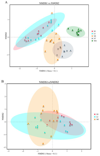 The results of the two-dimensional NMDS analysis at the level of OTUs. (A) The diversity analysis of habitats and fish intestines samples and (B) the diversity analysis of interindividual including HI, LI. and MI. (C) the diversity analysis of habitats including ST and WR. HI, T. houdemeri intestines; LI, H. leucisculus intestines; MI, O. mossambicus intestines; ST, sediment; and WR, water.