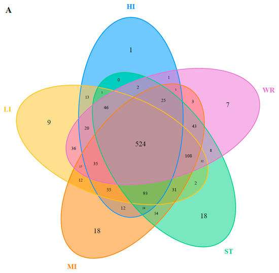(A) Venn plot showing OTU overlap of HI, LI, MI, ST, and WR; (B) Venn plot showing overlap of habitats and intestines in microorganisms. HI, T. houdemeri intestines; LI, H. leucisculus intestines; MI, O. mossambicus intestines; ST, sediment; and WR, water.