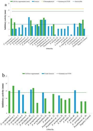 The CEs evidenced antibacterial activity against more target strains, namely S. aureus H1610, P. mirabilis H1643, K. pneumoniae H1637 and A. hydrophila H1563, while no activity was recorded against P. aeruginosa H1628. Of the CEs, 76.7% and 66.7% were active against S. aureus H1610 and K. pneumoniae H1637, respectively, while 20% of the CEs showed inhibitory activity against P. mirabilis H1643 and A. hydrophila H1563 (Figure 5). Specifically, three CEs (Pseudomonas aeruginosa 9, 13 and 15) exhibited antibacterial activity, showing halos ≥10 mm against S. aureus H1610, with the highest inhibition for 9 (14.5 ± 0.7 mm) (Table 2). The rest of the tested CEs exhibited antibacterial activity, with halos ranging from 5.5 ± 0.7 to 9.5 ± 0.7 mm, and two weak responses have been recorded for CEs from Pseudomonas sp. 25 and Pseudomonas anguilliseptica 41 (Table 2 and Figure 4a). Six CEs, showing inhibitory activity against the target strain P. mirabilis H1643, evidenced inhibitory ≥10.00 ± 0.0 mm, ranging from 12.0 ± 0.7 mm (CEs Pseudomonas aeruginosa 6 and Pseudomonas sp. 25) to 16.0 ± 0.0 (CE Pseudomonas alcaligenes 10) (Table 2 and Figure 5b). Five CEs resulted active against K. pneumoniae H1637 with halos ≥10.0 mm, and four weak responses have been evidenced by CEs from Pseudomonas alcaligenes 10, Aeromonas caviae 11, Enterobacter ludwigii 28, Aeromonas media 40 and Pseudomonas sp. 56. The highest activity was obtained by CE of Pseudomonas aeruginosa 1 (17.5 ± 0.7 mm) (Table 2 and Figure 4c). Finally, the antibacterial activity against A. hydrophila was exhibited in all cases, with halos ≤10.0 mm, with two weak responses (CEs from Aeromonas media 40 and Pseudomonas sp. 19) and four inhibitory halos ranging from 6.5 ± 0.7 to 8.0 ± 0.0 mm (Table 2 and Figure 5d).