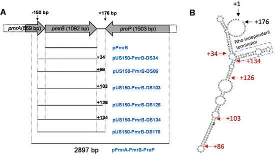 Diagram of subcloning strategy and the predicted stem-loop structure of 3′-downstream region of pmrB. (A) Stepwise subcloning and corresponding plasmid constructs (plasmid name in blue). Vertical dash lines cover the cloned major regions selected for subcloning. −150 bp, 150 bp upstream of pmrB ORF. The length of region downstream of pmrB ORF in different constructs was indicated by the number with “+” prefix. (B) Stem-loop structure prediction of 3′-downstream region of pmrB. The starting (+1) and ending (+176) of the 3′-downstream region of pmrB are indicated with black arrows. The transition sites between some stems and loops are indicated with arrows followed by the distance from the pmrB stop codon (in red); these sites were also selected for creating subcloning plasmids (detailed in A panel). The blue dash box indicates predicted Rho-independent terminator.