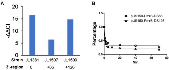 Since a significantly low level of pmrBBL21 mRNA was observed in JL1507 when compared to that in JL1509 (Figure 2A), the 3′-UTR length may modulate and determine the stability of pmrBBL21 mRNA, as observed in the regulation of other genes [,]. To test this hypothesis, the half-life of pmrB in JL1507 and JL1509 was further measured by rifampin arrest treatment followed by qRT-PCR. As shown in Figure 2B, after adding rifampin to stop new mRNA synthesis, the mRNA level of in both strains started to decrease rapidly at a similar rate. For JL1507 that carries plasmid pUS150-PmrB-DS86, the half-life of pmrB was 1.0 min (goodness-of-fit R2: 0.9786), while the pmrB mRNA half-life in JL1509 was 0.83 min (goodness-of-fit R2: 0.9572). The difference in mRNA in the half-life between JL1507 and JL1509 was not statistically significant (p > 0.05), indicating that the mRNA decay rate in the two strains is similar.