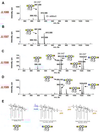 MS analysis of lipid A in the E. coli TOP10 strains bearing pmrBBL21 with different lengths of downstream regions. The doubly charged [M-2H]2− ions of lipid A species are shown. (A) Unmodified lipid A in JL1088, the control strain containing pZE21 vector only; (B) Unmodified lipid A in JL1507, which contains plasmid pUS150-PmrB-DS86; (C) Extensive modifications of lipid A by Ara4N and pEtN in JL1508, which contains plasmid pUS150-PmrB-DS103; (D) Extensive modifications of lipid A by Ara4N and pEtN in JL1509, which contains plasmid pUS150-PmrB-DS126. The pmrB carried in three recombinant plasmids are diagramed in Figure 1A. (E) Representative chemical structures and the corresponding cartoons of hexa-acylated lipid A and its Ara4N and pEtN modifications.