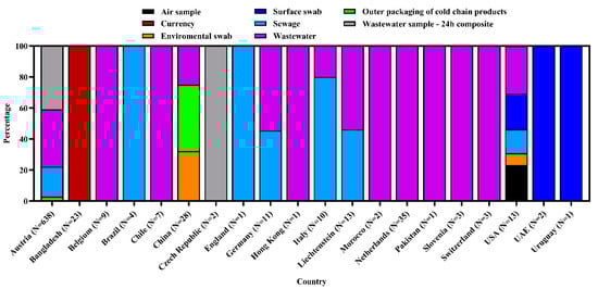 We found that 20 countries reported 807 SARS-CoV-2 sequences from different environmental samples across the globe. The SARS-CoV-2 RNA has been detected in diverse samples, namely, air, currency, environmental swab, surface swab, wastewater, sewage, and the outer packaging of cold chain products. Wastewater samples were highest (40.0%) to successfully yield the virus genome sequence followed by a 24 h composite wastewater sample (32.6%), and sewage (18.5%). The highest number of samples (n = 638) were sequenced in Austria, followed by the Netherlands, China, and Bangladesh (Figure 1 and Figure 2).