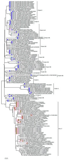 Phylogenetic analysis of SARS-CoV-2 genome sequences detected in environmental samples. Blue and red color denotes environmental strains, red color denotes the environmental alpha variants, fuchsia pink color refers to the reference sequence from Wuhan, China.