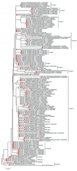 We searched the GISAID (https://www.gisaid.org/, accessed on 22 May 2021) repository for all sequences of the SARS-CoV-2 virus from different environmental sites around the world (Supplementary Table S1). We retrieved the sequences and collated them in Microsoft Excel. It should be noted that many other countries reported detection of SARS-CoV-2 without sequencing the virus. We did not include those reports in our study. We modified the time frame from 20 December 2019 to 22 May 2021. A total of 807 environmental samples have been sequenced and deposited in GISAID. We calculated the percentage of different environmental samples by country using STATA 13.0 and presented them graphically. We showed the distribution of SARS-CoV-2-positive environmental samples graphically using ArcGIS. Then, we used sequences > 29,000 nucleotides long for phylogenetic analysis using MEGA 7.0 software (MEGA, Auckland, New Zealand) []. We used the full-length nucleotide sequence of the Wuhan SARS-CoV-2 virus as the reference sequence (accession number NC_045512.2) []. We also calculated the percentages of lineages and clades of SARS-CoV-2 strains from environmental samples.