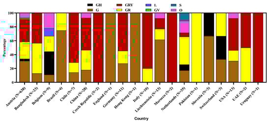 Among the studied 807 genome sequences from different environmental samples, scientists found clade GRY (32.7%), G (29.2%), GR (25.3%), O (7.2%), GH (3.4%), GV (1.4%), S (0.5%), and L (0.4%). Austria reported the most diverse clades, among which clade GRY was highest (32.3%), followed by G (30.9%), GR (24.6%), O (7.2%), GH (2.9%), GV (1.7%), and L (0.3%) in environmental samples. The Netherlands detected six clades whereas China and Liechtenstein each detected four clades. The clade S has only been reported from the Netherlands. The overall identified clade was nonspecifically denoted as Others (O) clade (Figure 5).