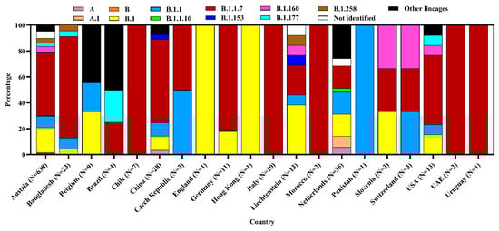 Various lineages were identified in environmental samples, but the highest percentage (49.4%) was under lineage B.1.1.7. Other prevalent lineages were B.1 (18.2%), B.1.1 (9.2%), and B.1.160 (3.9%). Furthermore, environmental strains belonged to other non-specific lineages. The most diverse (13) lineages have been reported from Austria where emerging α variant B.1.1.7 was highest at 48.9%. The USA and the Netherlands also reported diverse lineages where B.1.1.7 was 53.9% and 17.1%, respectively in each country (Figure 6).