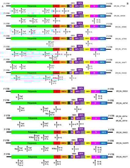Genomic mutation analysis of environmental-originated SARS-CoV-2. >> and marking indicating the mutational changes among 12 SARS-CoV-2 (EPI_ISL_408514 is not included due to Nil mutation) strain studied in this study in comparison with the reference strain NC_045512.2, hCoV19/Wuhan/WIV04/2019. Here, M—mutation; M(n)—Novel mutation; A—genomic structure; B—accession number; protein: G—glycine, L—Leucine, I—isoleucine, P—Proline, Y—Tyrosine, W—Tryptophan, S—Serine, T—Threonine, C—Cysteine, M—Methionine, N—Asparagine, Q—Glutamine, D—Aspartate, K—Lysine, R—Arginine, H—Histidine as of 21 May 2021.