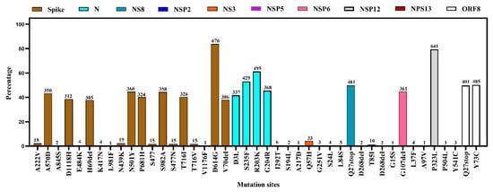 We observed a total of 43 mutations at different proteins of the viral genome. The most common amino acid substitutions were D614G (83.4%) followed by N501Y (44.6%), S982A (44.4%), A570D (43.3%), T716I (40.4%), and P681H (40.1%) in Spike (S) protein. N501Y and P681H are key mutations in the α variant. Another important key mutation is E484K for the South African variant which was found as 0.5% in studied genomes of the S protein. In the N protein, the highest mutation was R203K (61.3%). On the other hand, the NS3 and NS8 protein of environmental strains showed frequent mutations at Q57H and Q27stop, respectively. No mutation was recorded in NSP3 but other segments- NSP5, NSP6, NSP12, and NSP13 showed regular mutations at different points. In the ORF8 protein, mutations were found at Q27stop (49.7%) and Y73C (50.2%) (Figure 7 and Figure 8, and Supplementary File S1).
