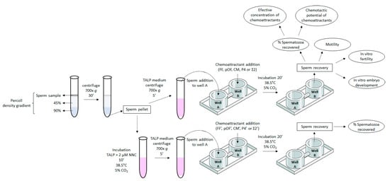 Both in natural breeding and some assisted reproduction technologies, spermatozoa are deposited into the uterus. The journey the spermatozoa must take from the place of semen deposition to the fertilization site is long, hostile, and selective of the best spermatozoa. For the fertilization to succeed, spermatozoa are guided by chemical stimuli (chemoattractants) to the fertilization site, mainly secreted by the oocyte, cumulus cells, and other substances poured into the oviduct in the periovulatory period. This work studied some sources of chemotactic factors and their action on spermatozoa functionality in vitro, including the fertility. A special chemotactic chamber for spermatozoa selection was designed which consists of two wells communicated by a tube. The spermatozoa are deposited in well A, and the chemoattractants in well B. This study focuses on the use of follicular fluid (FF), periovulatory oviductal fluid (pOF), conditioned medium from the in vitro maturation of oocytes (CM), and progesterone (P4) as chemoattractants to sperm. The chemotactic potential of these substances is also investigated as related to their action on CatSper which is a calcium channel in the spermatozoa known to be sensitive to chemoattractants and essential for motility.