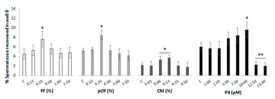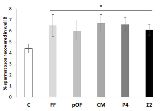 The results of the chemotactic potential of chemoattractants are shown in Figure 3. The % of spermatozoa recovered when a chemoattractant (FF: 6.5 ± 1.0%; pOF: 6.0 ± 0.9%; CM: 6.7 ± 0.8%; P4: 6.6 ± 0.6%; Σ2: 6.1 ± 0.5%) was added to well B was higher (p < 0.05) than the control (C: 4.4 ± 0.4%).