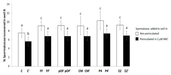 Chemotactic potential of chemoattractants and mechanism of action through CatSper. The percentage of spermatozoa attracted by the most effective concentration of each chemoattractant (0.25% FF, 0.25% pOF, 0.06% CM, 10.00 pM P4) was determined. That parameter was compared Table 10. min with 2 µΜ of the CatSper inhibitor NNC 55-0396 [] (FF′, pOF′, CM′, P4′). The combination of the most effective concentration of chemoattractants according to experiment 1.1 (Figure S2; Σ2 and Σ2′) was included in this study. The groups in which there was not a supplementation of chemoattractant in well B for selecting spermatozoa were included as control (C and C′). The results are expressed as man ± SEM. Four replicates were performed. Different letters (a–c) indicate statistical differences between groups (p < 0.05).