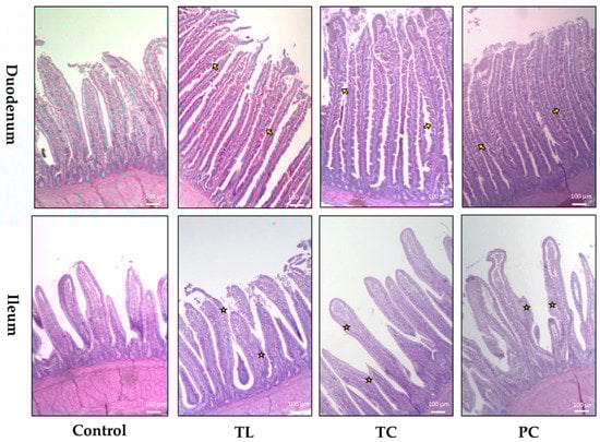 Illustrative photomicrographs showing the effects of dietary microalgae on intestinal morphology in broiler chickens (40× magnification, HE staining). Sections of the duodenum and ileum show thin and tall villi in treated animals, whereas thick and short villi were characteristic of untreated birds. In duodenal sections, marked serrated surfaces were observed in the tall separated villi in chickens supplemented with microalgae biomass (yellow arrows). In ileal sections, intestinal epithelial proliferation and goblet cell differentiation can be observed in microalgae-enriched groups (yellow star). TL: Tysochrysis lutea; TC: Tetraselmis chuii; PC: Porphyridium cruentum. HE: hematoxylin and eosin.