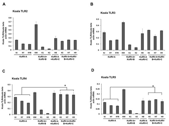 TLRs play a vital role in host defense against microbial infections. To the authors’ knowledge, this is the first study to profile TLR expression in koala PBMCs infected with an endogenous KoRV-A subtype, or co-infected with KoRV-B and/or KoRV-C. To this end, we characterized expression patterns of TLR2–10 and TLR13 mRNA in koala PBMCs, based on KoRV subtypes (KoRV-A, KoRV-B, and KoRV-C). In addition, we investigated the expression patterns of these key innate immune molecules in tissues from an adult koala and a joey to gain insight into the relative TLR response in KoRV infection.