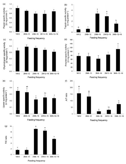 Specific activities of fecal digestive enzymes in hawksbill sea turtle fed at different frequencies: pepsin (a), trypsin (b), chymotrypsin (c), amylase (d), lipase (e), A/T ratio (f), and T/C ratio (g). The feces were sampled at the end of the eight-week experiment. Data are expressed as tank mean ± SEM. Different superscripts indicate a significant difference (p < 0.05). A/T ratio is the ratio of amylase to trypsin; T/C ratio is the ratio of trypsin to chymotrypsin.