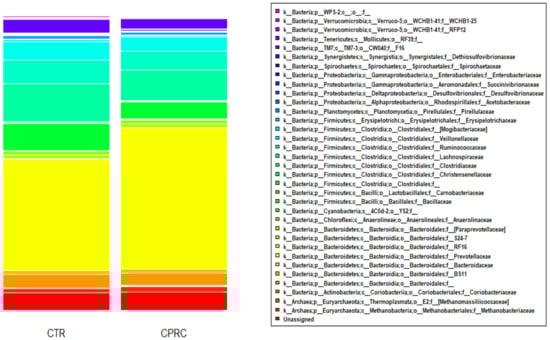 At the family level (Supplementary Materials Table S2), the diet with CPRC decreased RA of the undefined families within the order Clostridiales (p = 0.016), Christensenellaceae (p = 0.033), and the undefined families within the order RF39 (p = 0.024) and tended to decrease RA of Lachnospiraceae (p = 0.08), Ruminococcaceae (p = 0.08), and Pirellulaceae (p = 0.055).