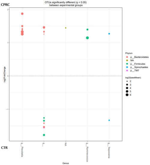 OTUs at the genus level were significantly different (q < 0.05) between rumen samples of cows fed the control (CTR; below) and concentrate with cold-pressed rapeseed cake (CPRC; above). Each point represents a single OTU colored by phylum and grouped on the x-axis by taxonomy. The size of the point reflects the log2 mean abundance of the sequence data.