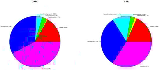 Mean relative abundances of Eukaryote phyla in the rumen samples of cows fed a concentrate with cold-pressed rapeseed cake (CPRC) or a control concentrate (CTR). “Others” include phyla with relative abundance <0.1% and phyla related to feed and the host (Charophyta, Chlorophyta, and Chordata).