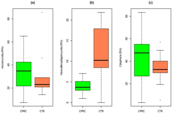 Relative abundances of the three main Eukaryote phyla in rumen samples of cows fed a concentrate with cold-pressed rapeseed cake (CPRC) or a control concentrate (CTR). (a) Relative abundance of Ascomycota, (b) relative abundance of Neocallimastigomycota, and (c) relative abundances of Ciliophora.