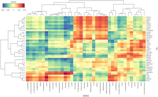 Associations between bacterial genus and ruminal fatty acid proportions independent of the experimental group. Clustered image map based on the regularized canonical correlations between bacterial relative abundances at the genus level and ruminal proportions of fatty acids. Significative correlations are colored following the key shown.