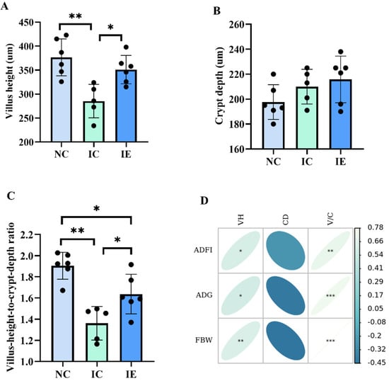 The effects of EGF on the intestinal morphology of piglets with IUGR are presented in Figure 1. It shows that VH (Figure 1A) and V/C (Figure 1C) were markedly changed in this study (p < 0.05); however, there was no difference in CD (Figure 1B) among the three groups. IUGR reduces VH (p < 0.01) and V/C (p < 0.01) significantly. Meanwhile, EGF administration exhibited increased (p < 0.05) VH and V/C in the jejunum of IUGR piglets (IE group) when compared with the IC group. Pearson’s correlation analysis (Figure 1D) showed that VH (p < 0.05, p < 0.05, p < 0.01) and V/C (p < 0.01, p < 0.001, p < 0.001) were positively correlated with the ADFI, ADG, and FBW of piglets.