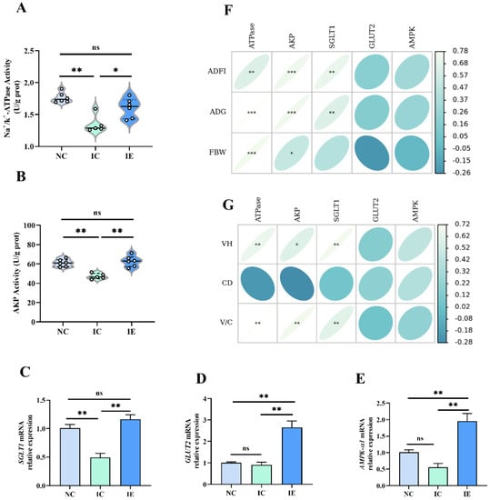Effects of EGF on the intestinal glucose absorption capacity of piglets with IUGR. (A) Na+/K+-ATPase activity, (B) AKP activity, (C) SGLT1 mRNA, (D) GLU2 mRNA, (E) AMPK-α1 mRNA, (F) correlations analysis between intestinal glucose absorption capacity and growth performance, (G) correlations analysis between intestinal glucose absorption capacity and intestinal morphology. Values are expressed as means ± SEM, n = 6 (1 pig in the IC group was dead, n = 5 in the IC group); NC: NBW piglets fed with basal diet; IC: IUGR piglets fed with basal diet; IE: IUGR piglets fed with basal diet supplemented with 2 mg/kg EGF. * p < 0.05, ** p < 0.01, *** p < 0.001.