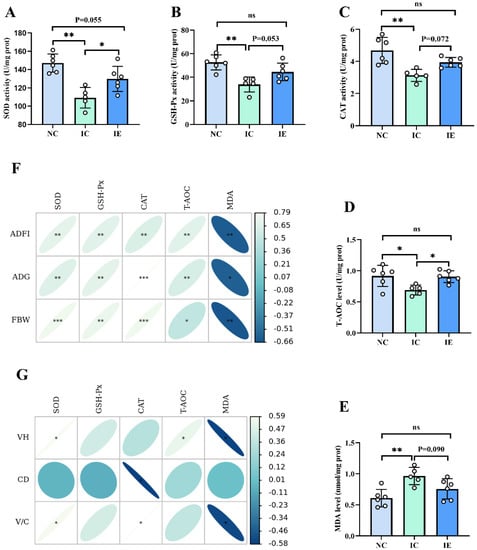 Effects of EGF on the intestinal antioxidant capacity of piglets with IUGR. (A) SOD, (B) GSH-Px, (C) CAT, (D) T-AOC, (E) MDA, (F) correlation analysis between intestinal antioxidant capacity and growth performance, (G) correlation analysis between intestinal antioxidant capacity and intestinal morphology. Values are expressed as means ± SEM, n = 6 (1 pig in the IC group was dead, n = 5 in the IC group); NC: NBW piglets fed with basal diet; IC: IUGR piglets fed with basal diet; IE: IUGR piglets fed with basal diet supplemented with 2 mg/kg EGF. * p < 0.05, ** p < 0.01, *** p < 0.001.