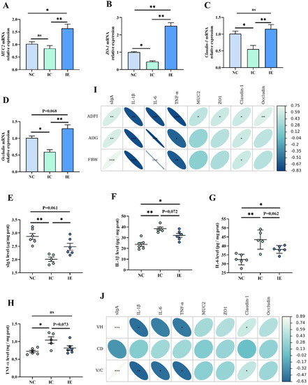 Effects of EGF on the intestinal barrier function of piglets with IUGR. (A) MUC2 mRNA, (B) ZO-1 mRNA, (C) Claudin-1 mRNA, (D) Occludin mRNA, (E) sIgA level, (F) IL-1β level, (G) IL-6 level, (H) TNF-α level, (I) correlation analysis between intestinal barrier function and growth performance, and (J) correlation analysis between barrier function and intestinal morphology. Values are expressed as means ± SEM, n = 6 (1 pig in the IC group was dead, n = 5 in the IC group); NC: NBW piglets fed with basal diet; IC: IUGR piglets fed with basal diet; IE: IUGR piglets fed with basal diet supplemented with 2 mg/kg EGF. * p < 0.05, ** p < 0.01, *** p < 0.001.