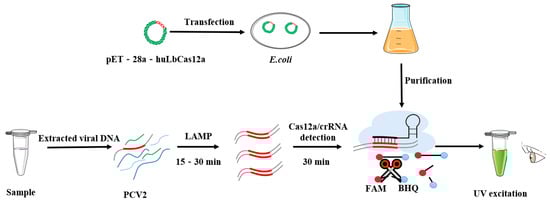 Schematic of LAMP amplification, hubLCas12a protein preparation and Cas12a/crRNA cleavage for visualizing the presence of PCV2-specific nucleic acids.