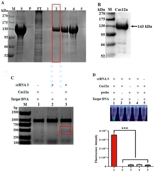 Purification huLbCas12a protein and its cleavage activity analysis. (A) The supernatant and precipitation of lysed Rosetta DE3 was fractioned by SDS-PAGE and stained by Coomassie blue. M: PM0500 protein Marker; P: Precipitation; S: Supernatant; FT, Flow-through sample. 1, 2, 3, 4, 5: The proteins eluted by buffers containing different concentrations of imidazole including 10, 30, 50, 100, and 500 mM, respectively. The red-marked frame indicated the LbCas12a protein used for subsequent experiments. (B) Western blot analysis of the purified huLbCas12a protein. (C) The verification of the cis-cleavage activity of the LbCas12a protein was assessed by its cleavage of target DNA fragment and presented by nucleic acid gel electrophoresis. The red frame marked area represents the cleavage products. M: DL3000 DNA Marker; the presence (+) or absence (−) of individual components is indicated above. (D) The trans-cleavage activity of LbCas12a protein. the presence (+) or absence (−) of individual components is indicated above the panel. Corresponding fluorescence intensity of each tube is shown in the lower panel (n = 3 technical replicates, value represents mean ± SEM, where *** represents p < 0.001).